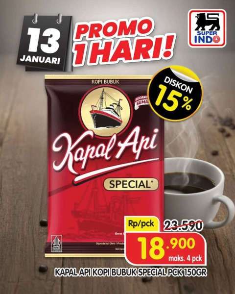 Selanjutnya dapatkan kopi bubuk spesial Kapal Api diskon 15% atau harga Rp 18.900, maksimal beli 4.
