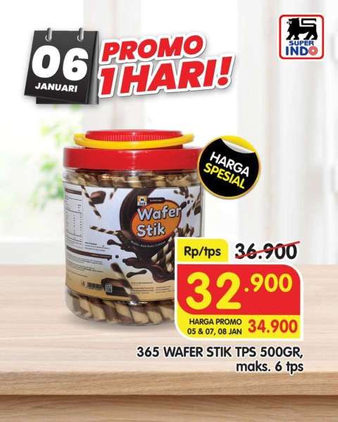 Belanja wafer stik 365 ukuran 500 gram Rp 32.900 dan Wipol 750 ml Rp 11.500, maksimal beli 6 di Superindo.