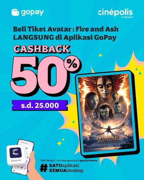 Promo tiket film Avatar: Fire and Ash dengan Gopay di Cinepolis berlaku sampai tanggal 15 Januari 2026.