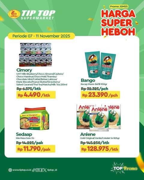 Di promo Tip Top weekend juga ada harga spesial untuk susu UHT Cimory 250 ml, Bango Rp 950 gram, mie Sedaap dan Anlene.
