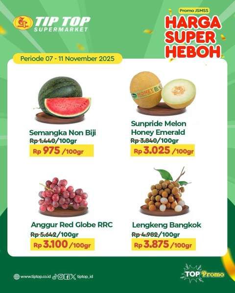 Di promo Tip Top weekend terbaru bulan November 2025 Anda bisa mendapatkan semangka non biji Rp 975/100 gram.