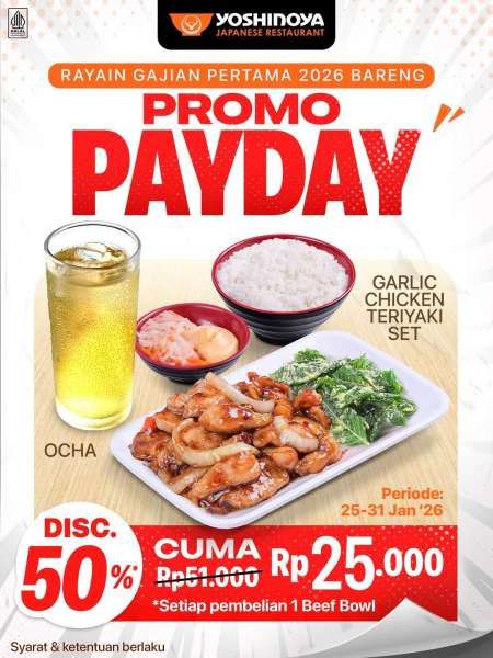 Selanjutnya, ada promo payday untuk makanan lebih murah yang bisa didapatkan di Yoshinoya bulan Januari 2026.