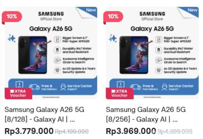 Sebagai perbandingan, harga asli Samsung A26 5G saat dirilis adalah Rp 4.199.000 untuk varian 128GB dan Rp 4.399.000 untuk varian 256GB.
